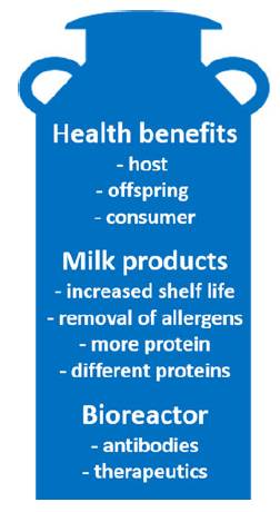 (图注:有益于健康:家畜后代、消费者;奶制品:延长保质期、去除过敏原、增加蛋白量、包含不同的蛋白;生物反应器:抗体、治疗)
