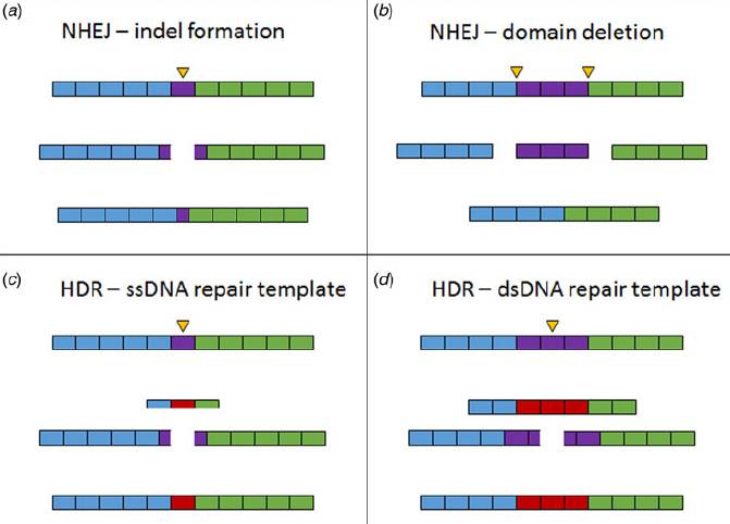 细胞内的DNA断裂修复机制包括非同源末端连接(NHEJ)和非同源定向修复(HDR)。据此研究者可以实现基因上任意形式的改变。