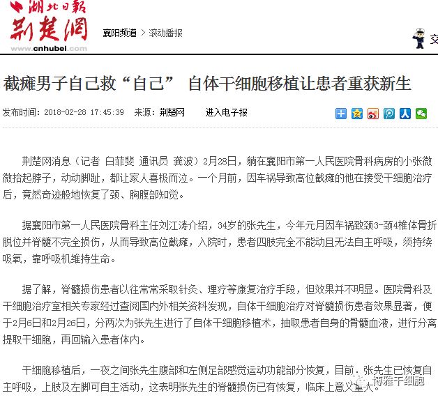 事实上,近年来干细胞治疗脊髓损伤相关截瘫的成功案例并不罕见。去年8月,64岁的脊髓损伤、下肢瘫痪患者陈双喜在中山大学附属第三医院接受脐带间充质干细胞治疗后,能够从轮椅上站起来,并在支具辅助下缓慢迈开脚步。当时,广州日报以《坐轮椅14年 奇迹站起来》为题报道了此案例,并受到了广泛的关注。