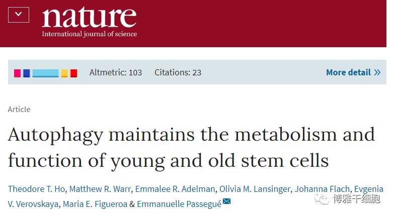 2017年3月,《Nature》上的研究发现,自噬是干细胞抗衰老的手段。自噬是细胞对抗恶劣环境的重要手段,造血干细胞可以利用这种方法来维持自身的年轻化。根据这些研究结果,未来或许可以通过重新激活老化造血干细胞的自噬过程来减慢血液系统的老化。这一研究发现有助于找到延缓或逆转老化相关慢性病的新方法。