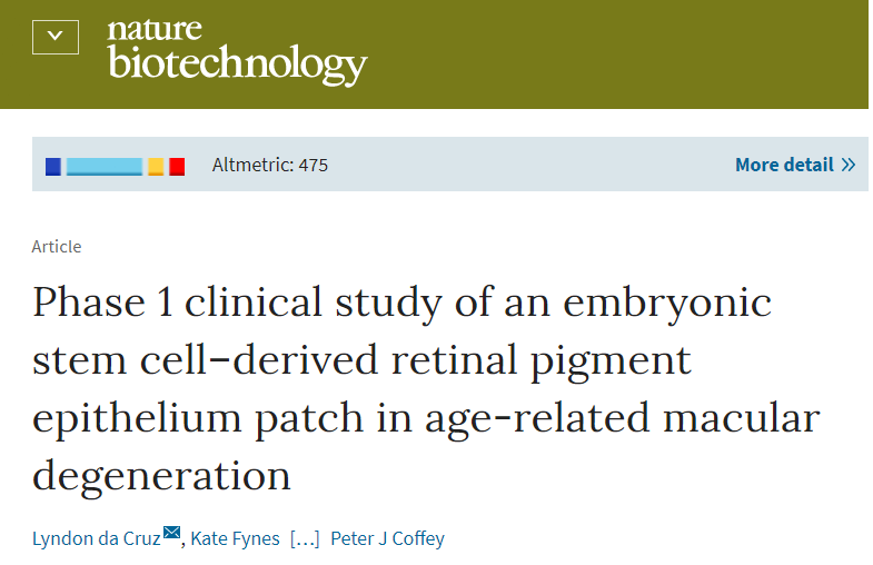 事实上,用人类胚胎干细胞衍生的视网膜色素上皮细胞来治疗年龄相关性黄斑变性也曾有多项报道,并且也取得了一些喜人的结果。